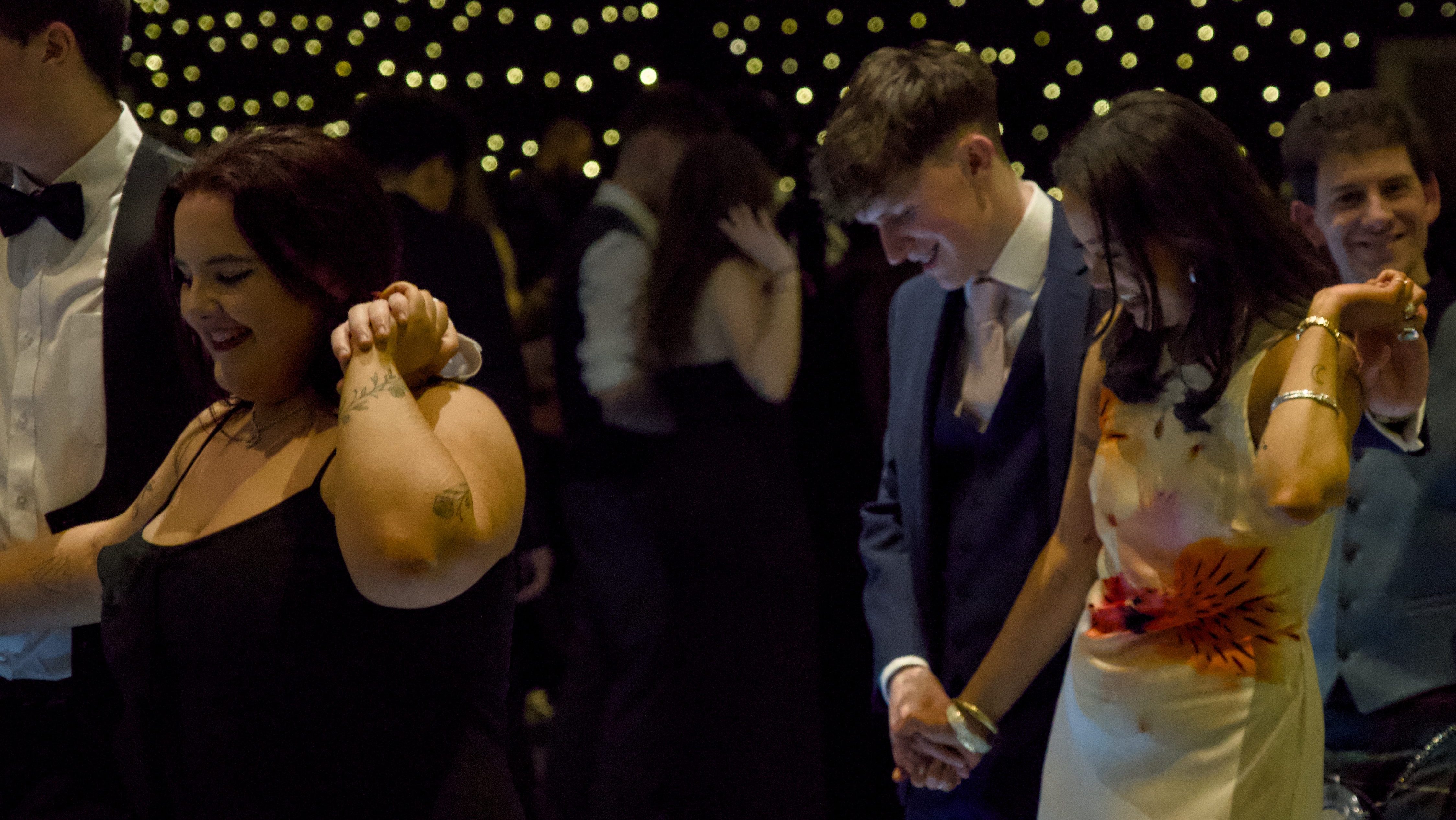 Right hands joined over the outside person’s shoulder and left hand joined in front, walk forward for four steps, starting on the right foot.